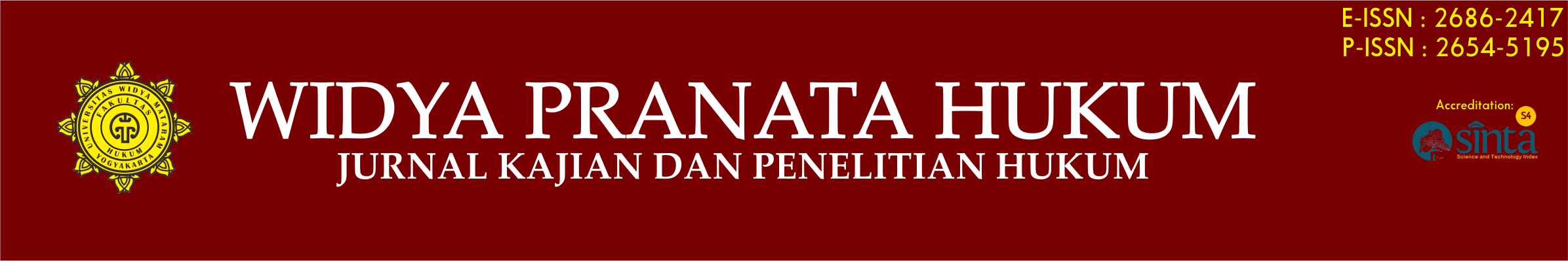 Widya pranata law is a peer-reviewed open access research and research journal affiliated with the Faculty of Law of the University of Widya Mataram and published by the Law Faculty of the University of Widya Mataram in a printed version. First published in 2019. The purpose of this journal is to serve as a container for law scholars and law researchers who want to share and contribute ideas in the study of law. Studies include: Criminal law; Civil law; State order law; Administrative law; International law; Islamic law; Law and Society; Economic and Business Law; Environmental Law; Medical Law; and Employment Law. It comes out twice a year in February and September.